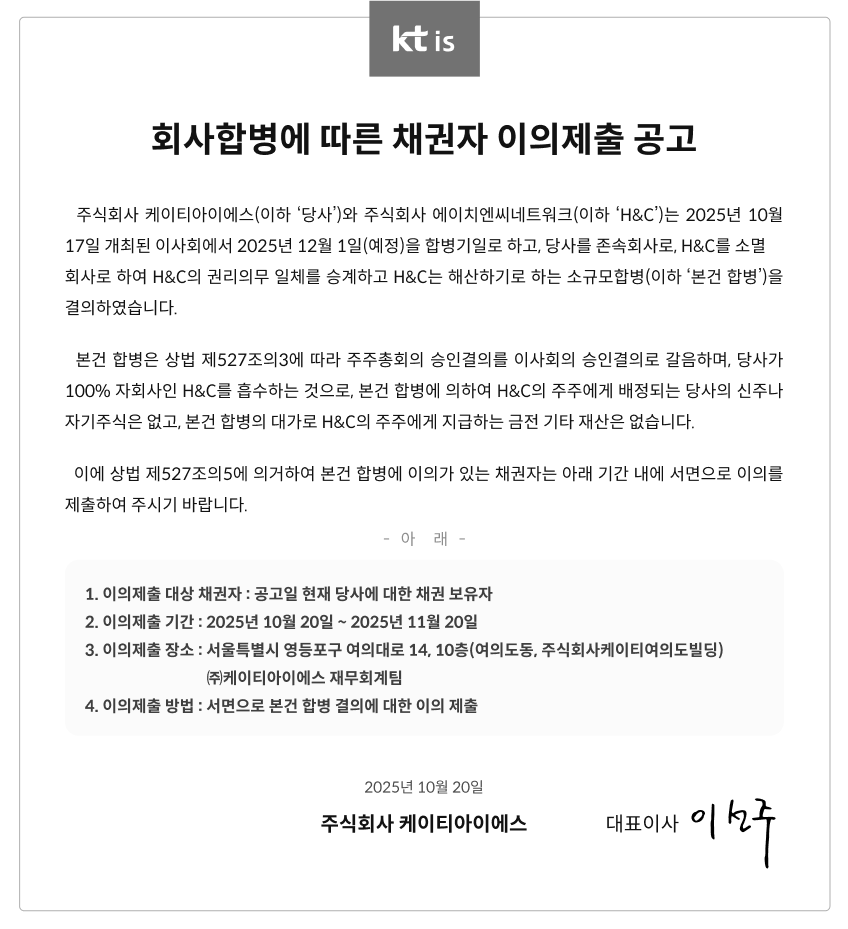 공고 회사합병에 따른 채권자 이의제출 공고 2025.10.20 회사합병에 따른 채권자 이의제출 공고.png 이전글 이전글이 없습니다. 다음글 소규모 합병 공고 2025.09.11 목록으로