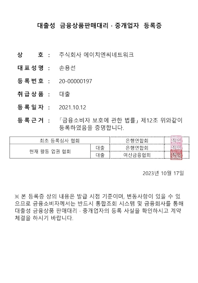 공고 금융상품판매대리 중개업자 등록증(에이치엔씨네트워크) 2025.12.01 당사는 (주)에이치엔씨네트워크를 2025년 12월 1일자로 합병하여 (주)에이치엔씨네크워크의 권리와 의무를 승계함에 따라 (주)에이치엔씨네트워크의 금융상품판매대리중개업자 등록증을 공고합니다. 금융상품판매대리·중개업자 등록증_H&C.jpg 이전글 금융상품판매대리 중개업자 등록증 2025.12.01 다음글 금융소비자보호법 제16조 게시의무 등에 따른 공지 2025.12.01 목록으로