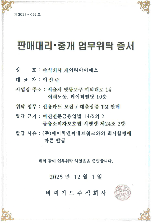 공고 금융상품 판매대리·중개업무 위탁증서(비씨카드) 2025.12.01 금융상품판매대리중개 업무 위탁 증서_비씨카드.pdf 이전글 금융상품판매대리 중개업자 위탁증서(중소기업은행) 2025.12.01 다음글 금융상품판매대리 중개업자 등록증 2025.12.01 목록으로