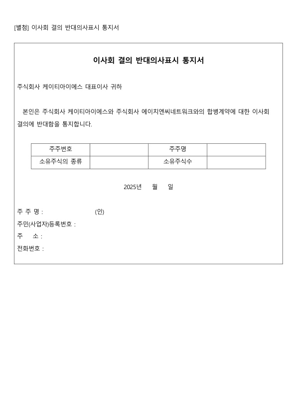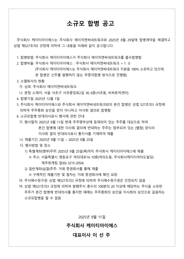 공고 소규모 합병 공고 2025.09.11 소규모 합병 공고_F.jpg [별첨] 이사회 결의 반대의사표시 통지서.jpg 이전글 회사합병에 따른 채권자 이의제출 공고 2025.10.20 다음글 기준일 및 주주명부 폐쇄기간 설정 공고 2025.08.27 목록으로