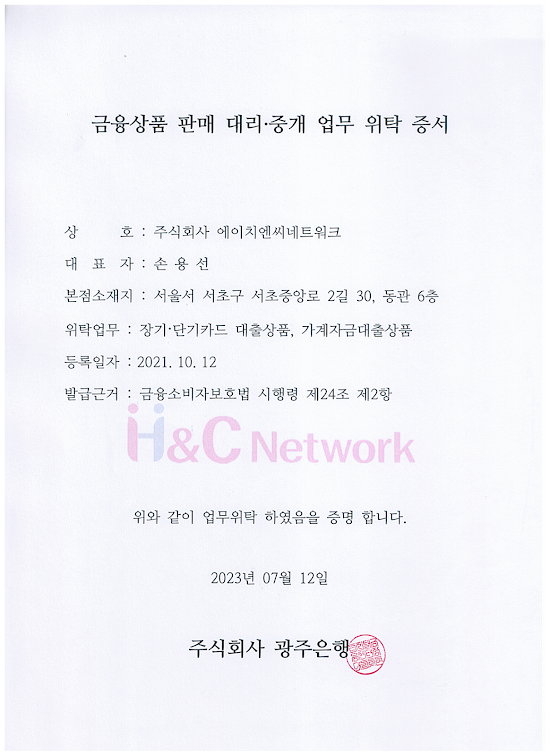공고 금융상품판매대리중개업자 위탁증서(광주은행) 2025.12.01 당사는 (주)에이치엔씨네트워크를 2025년 12월 1일자로 합병하여 (주)에이치엔씨네크워크의 권리와 의무를 승계함에 따라 (주)에이치엔씨네트워크의 금융상품판매대리중개업자 위탁증서를 공고합니다. 금융상품판매대리중개 업무 위탁 증서_광주은행.png 이전글 이전글이 없습니다. 다음글 금융상품판매대리 중개업자 위탁증서(기업은행) 2025.12.01 목록으로