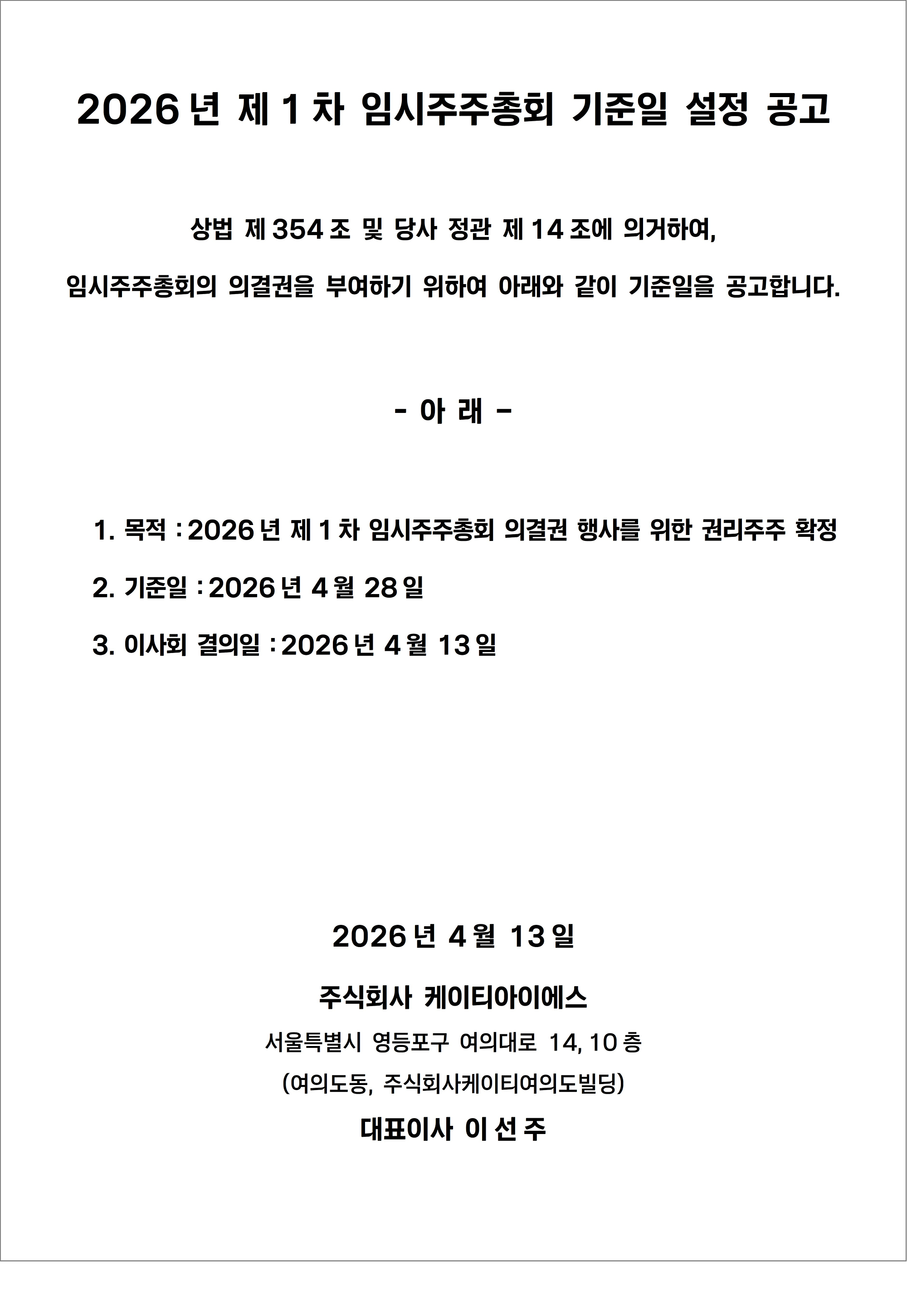 공고 기준일 설정 공고 2026.04.13 2026년 제1차 임시주주총회 기준일 설정 공고_F.jpg 이전글 이전글이 없습니다. 다음글 제25기 결산공고 2026.03.31 목록으로